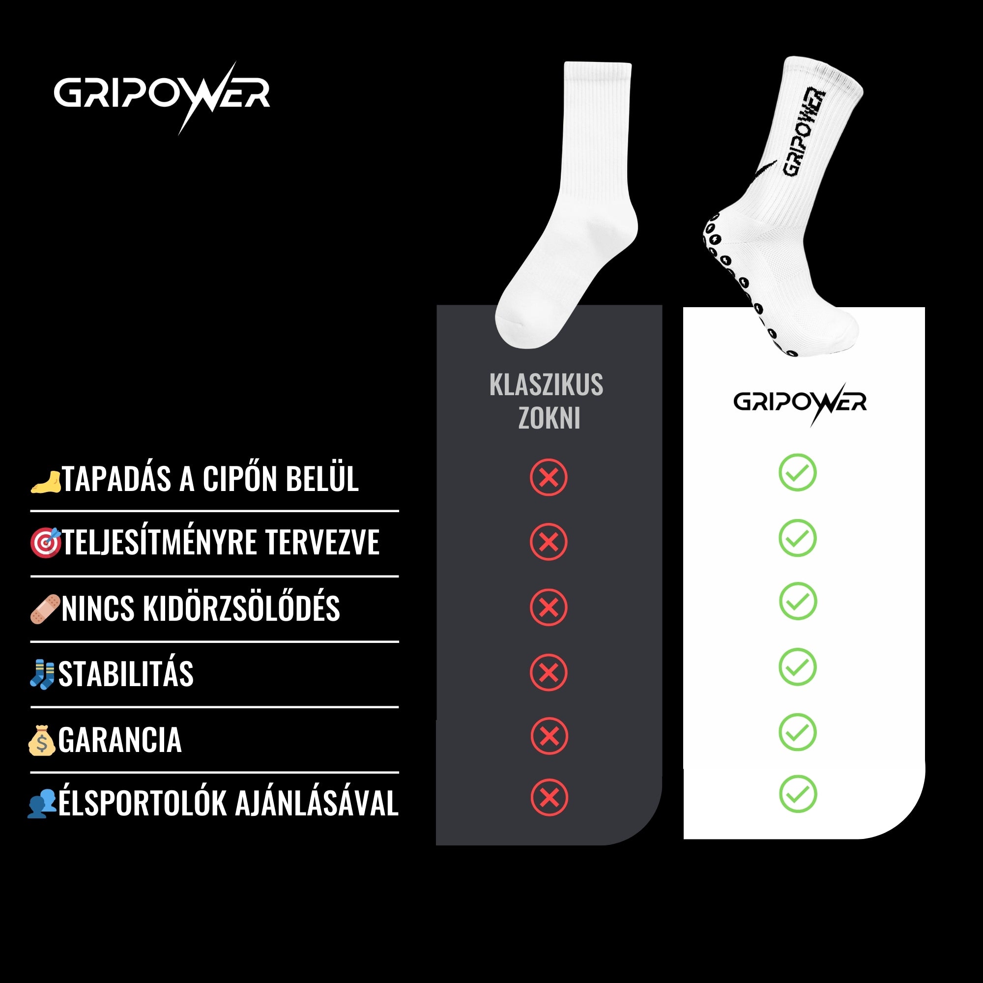 A Gripower zoknik innovatív tapadási technológiával, kényelmes és tartós anyagból készülnek, amelyek támogatják a stabilitást és a kitámasztások gyorsaságát. Ideálisak különböző sporttevékenységekhez, profi és amatőr sportolóknak egyaránt.